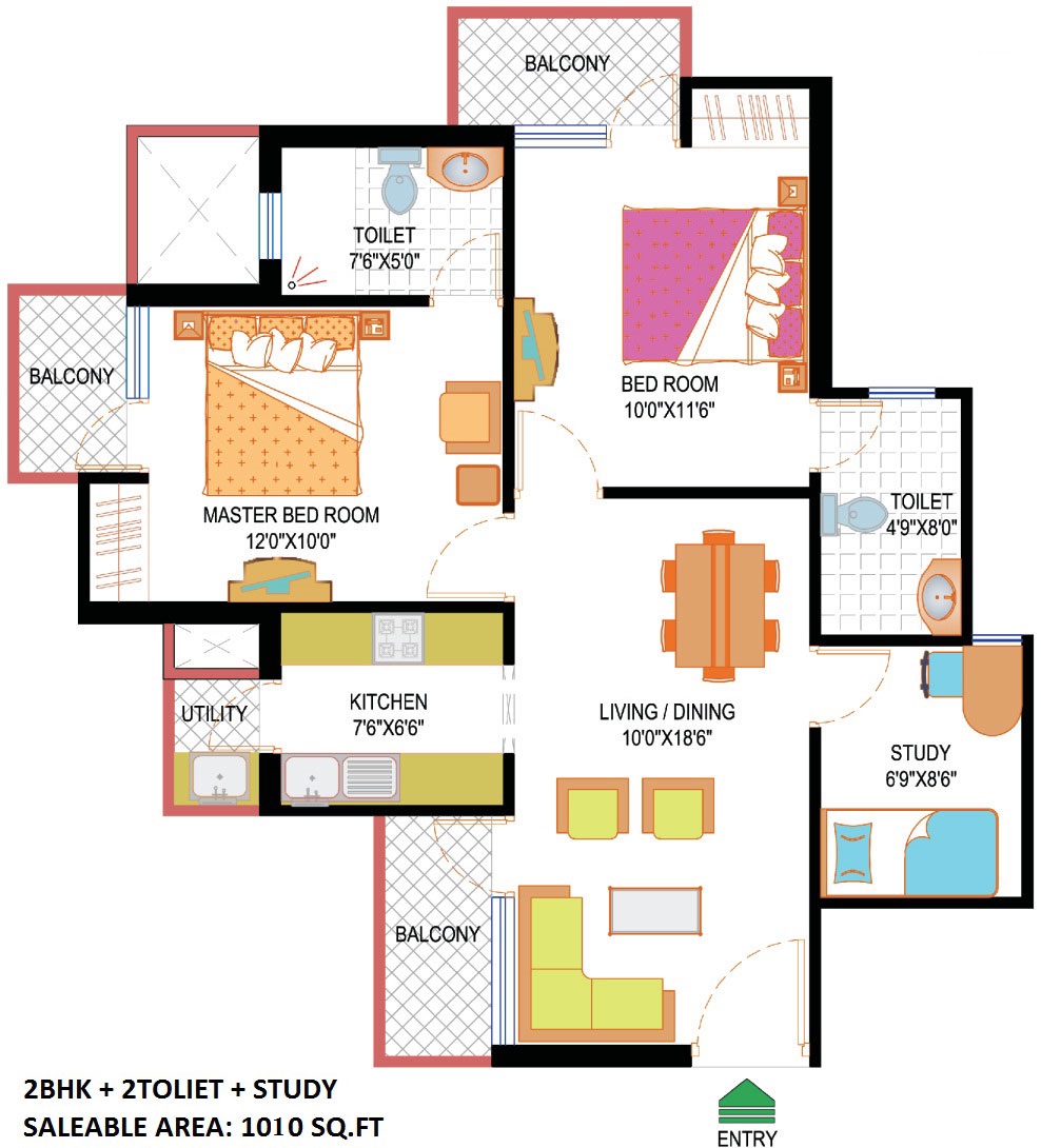 (4900/sq ft)Below 10th View Plan 2 BHK+2T+Study Room 1010 sq ft 49,49,000