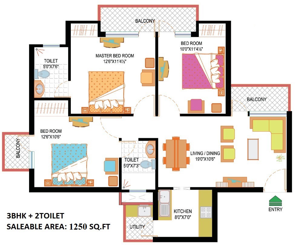 (4900/sq ft)Below 6th View Plan 3 BHK+2 T+UTL 1250 sq ft 61,25,000